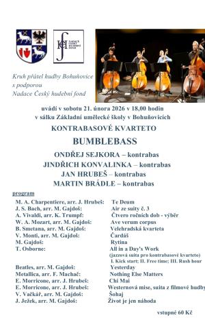 Kruh přátel hudby vás srdečně zve na koncert kontrabasového kvarteta BUMBLEBASS. V pestrém programu zazní v unikátních aranžích skladby různých autorů napříč staletími, jejichž provedením se vás interpreti pokusí přesvědčit, že kontrabas zdaleka není jen doprovodným nástrojem.