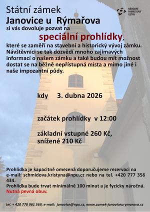 V pátek 3. dubna 2026 se uskuteční speciální prohlídka na zámku Janovice. Ta se zaměří na historický a stavební vývoj zámku. Návštěvníci se tak dozvědí mnoho zajímavých informací o našem zámku a také budou mít možnost dostat se do běžně nepřístupných prostor, a to i na naše impozantní půdy.