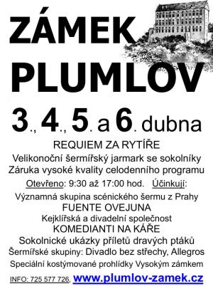 O velikonočním prodlouženém víkendu od pátku 3. do pondělí 6. 4. 2026 se v prostorách zámku Plumlov odehraje akce Requiem za rytíře aneb Velikonoční šermířský jarmark se sokolníky. Aby si každý z návštěvníků našel to své, pro každý den bude připraven speciální program.