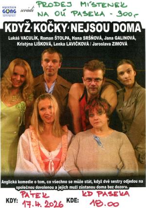 V pátek 17. dubna navštíví obec Paseka divadlo s Lukášem Vaculíkem v hlavní roli KDYŽ KOČKY NEJSOU DOMA.