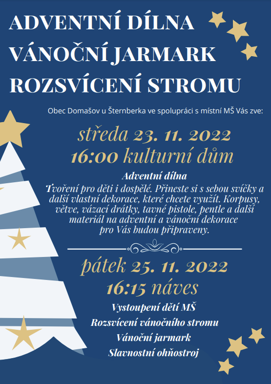 Obec Domašov u Šternberka pořádá ve středu 23. listopadu 2022 od 16:00 hodin v kulturním domě Adventní dílnu. V pátek 25. listopadu v 16:15 na návsi pak proběhne slavnostní rozsvícení vánočního stromu.