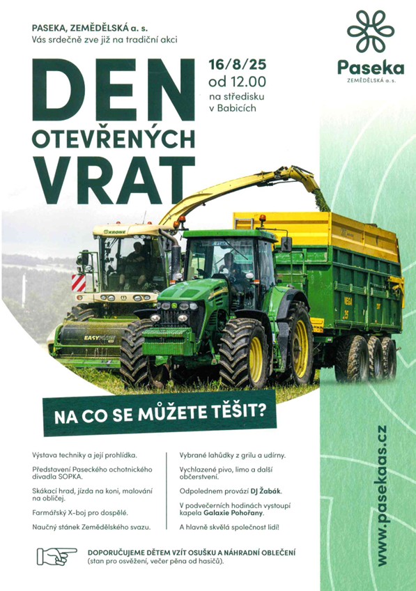 Srdečně zveme na akci s názvem „Den otevřených vrat“, která se koná 16. srpna 2025 od 12 hodin na středisku v Babicích. Těšit se můžete na výstavu techniky a její prohlídku, skákací hrad, jízdu na koni, malování na obličej, farmářský X-boj pro dospělé a mnoho dalšího.