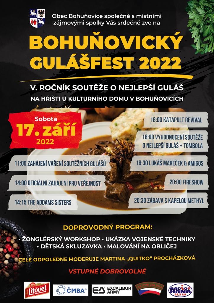 Obec Bohuňovice ve spolupráci s místními zájmovými spolky vás zvou v sobotu 17. září 2022 na V. ročník soutěže o nejlepší guláš. Akce se uskuteční na hřišti u Kulturního domu v Bohuňovicích.