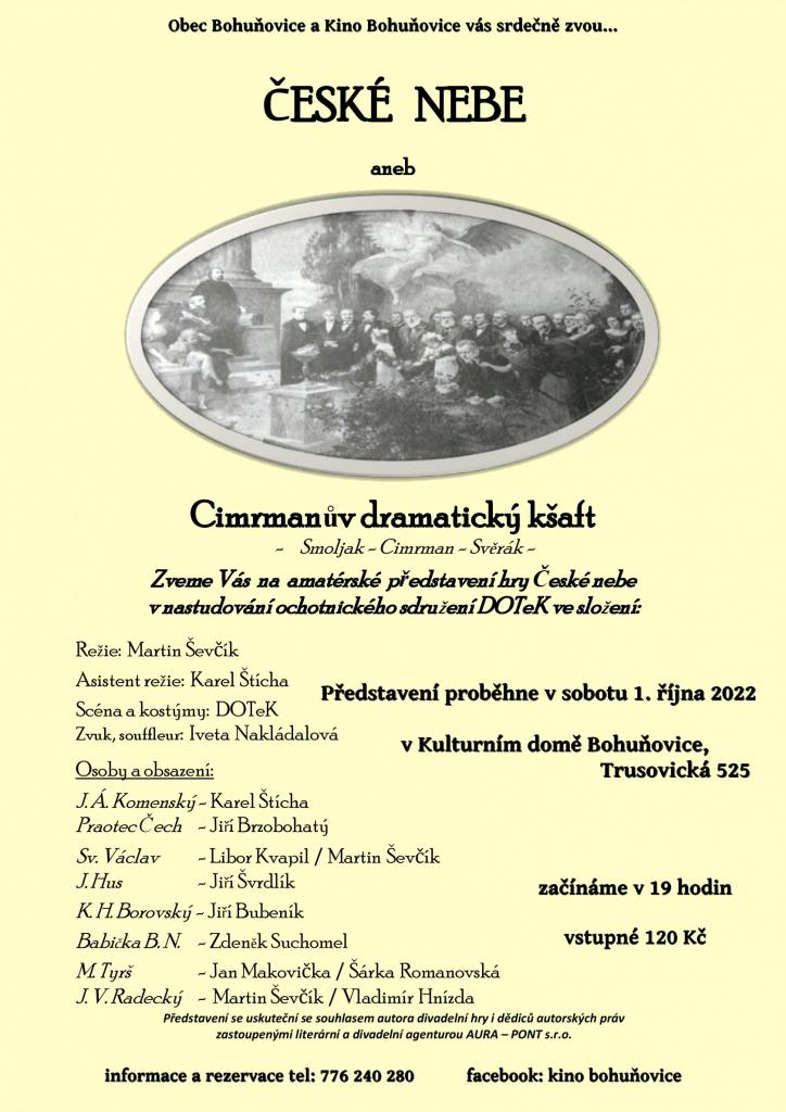 Obec Bohuňovice a Kino Bohuňovice Vás srdečně zvou na amatérské představení hry České nebe v nastudování ochotnického sdružení DOTeK. Představení proběhne v sobotu 1. října 2022 v Kulturním domě Bohuňovice v 19:00 hodin. Jednotné vstupné 120 Kč.