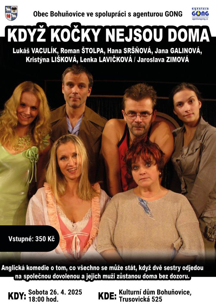 Obec Bohuňovice zve své návštěvníky na divadelní představení Když kočky nejsou doma, které se odehraje 26. dubna 2025 v 18:00 hodin v Kulturním domě Bohuňovice.