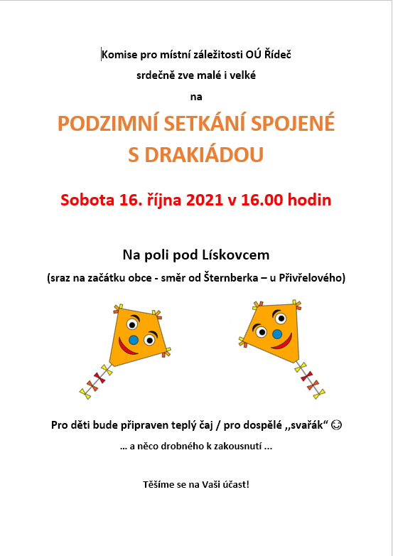 Děti, doma si nezapomeňte létajícího draka! Pro návštěvníky bude připraveno drobné občerstvení - pro děti teplý čaj, pro dospělé svařené víno... a něco malého k zakousnutí... Těšíme se na Vaši účast!