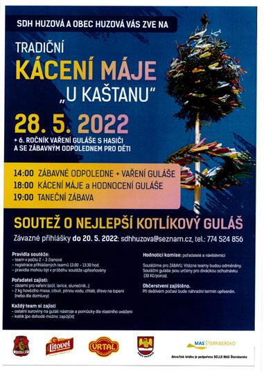 SDH Huzová a obec Huzová Vás srdečně zvou na tradiční kácení máje a soutěž o nejlepší kotlíkový guláš. Akce se uskuteční v sobotu 28. května 2022 od 14:00 hodin v obci Huzová. Těšit se můžete na bohatý program a občerstvení.
