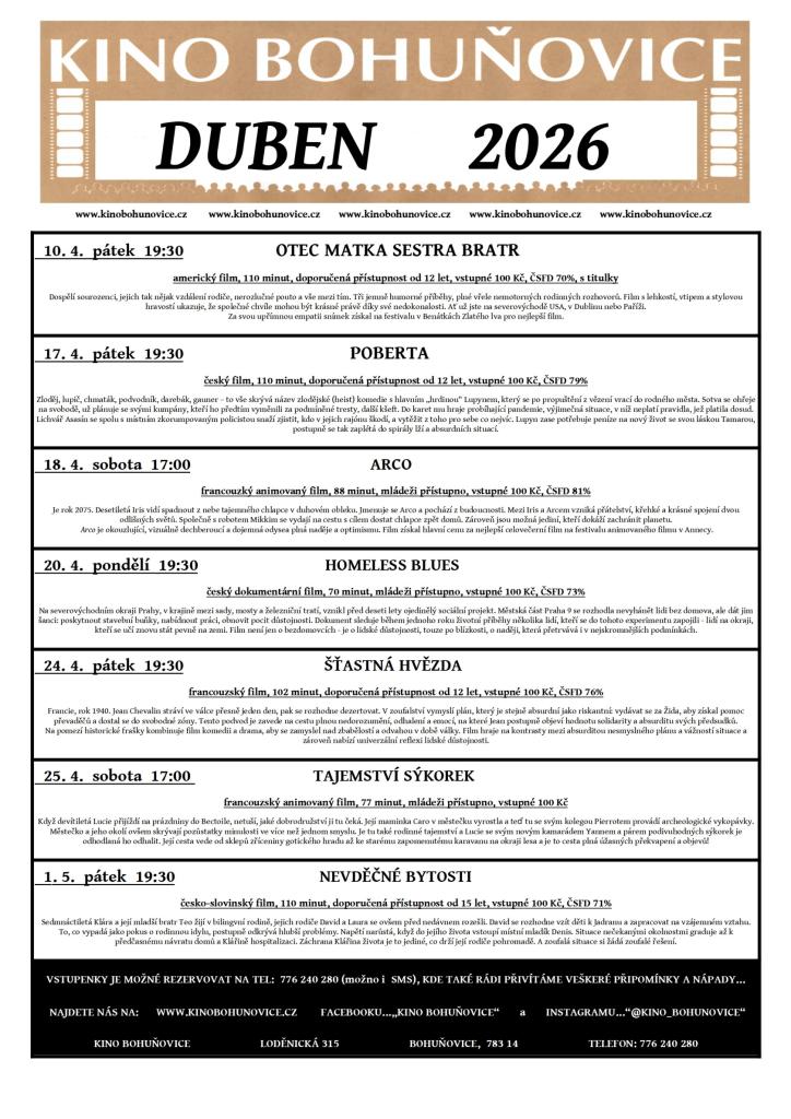 Přinášíme vám program Kina Bohuňovice na měsíc duben 2026.