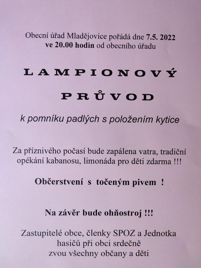 Obec Mladějovice Vás zve na Lampionový průvod ,který se koná 7. května 2022 od 20:00 hodin u obecního úřadu. Všichni jsou srdečně zváni.