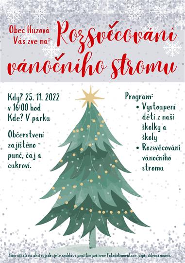 V pátek 25. listopadu 2022 v 16:00 hodin pořádá obec Huzová slavnostní rozsvícení vánočního stromku.