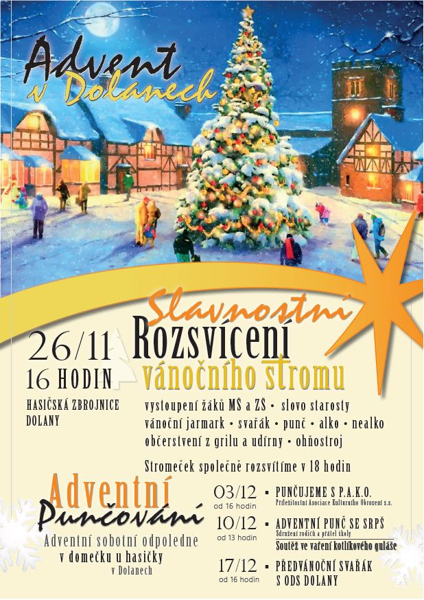 V sobotu 26. listopadu 2022 v 16:00 hodin proběhne v obci Dolany slavnostní rozsvícení vánočního stromu.