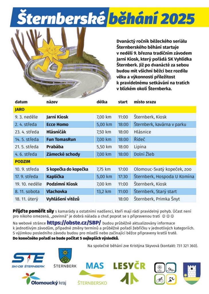Dvanáctý ročník běžeckého seriálu Šternberské běhání je tu. Všichni běžci bez rozdílu věku a výkonnosti mají příležitost k pravidelnému setkávání na tratích v blízkém okolí Šternberka. Bližší informace najdete na přiloženém plakátu.