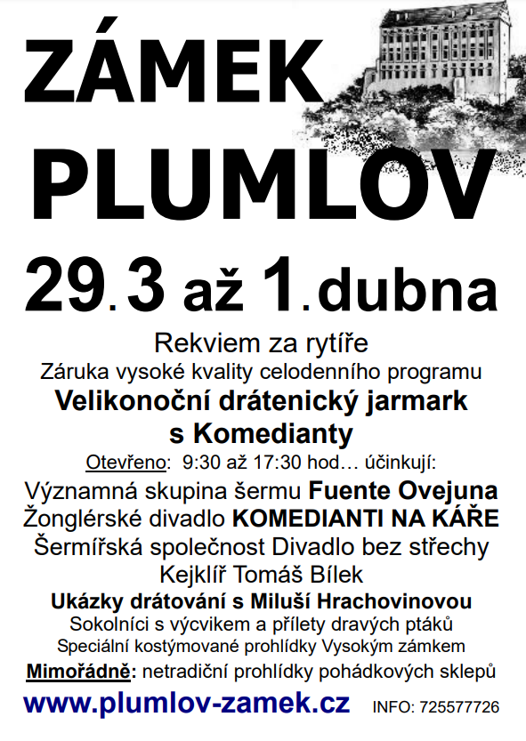 Tak jako obvykle zahajujeme naši sezónu o velikonočním víkendu v areálu zámku PLUMLOV. Letos tomu nebude jinak, i když Velikonoce jsou již 29.3 - 1.4.2024. Budeme se spolu bavit, budeme se spolu smát a užívat si krásný víkend na akci s názvem REQUIEM ZA RYTÍŘE, aneb Velikonoční jarmark s komedianty.