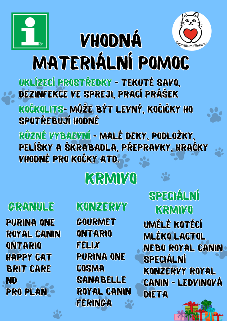 A co všechno můžete do infocentra nosit? Kočičky ocení hlavně krmivo a konzervy (Purina One, Royal Canin, Happy Cat, Gourmet, Ontario, Felix atd.), dále speciální krmivo (umělé kotěcí mléko Lactol nebo Royal Canin, speciální konzervy Royal Canin - ledvinová dieta) nebo kočkolit: může být levný, kočky ho spotřebují hodně.