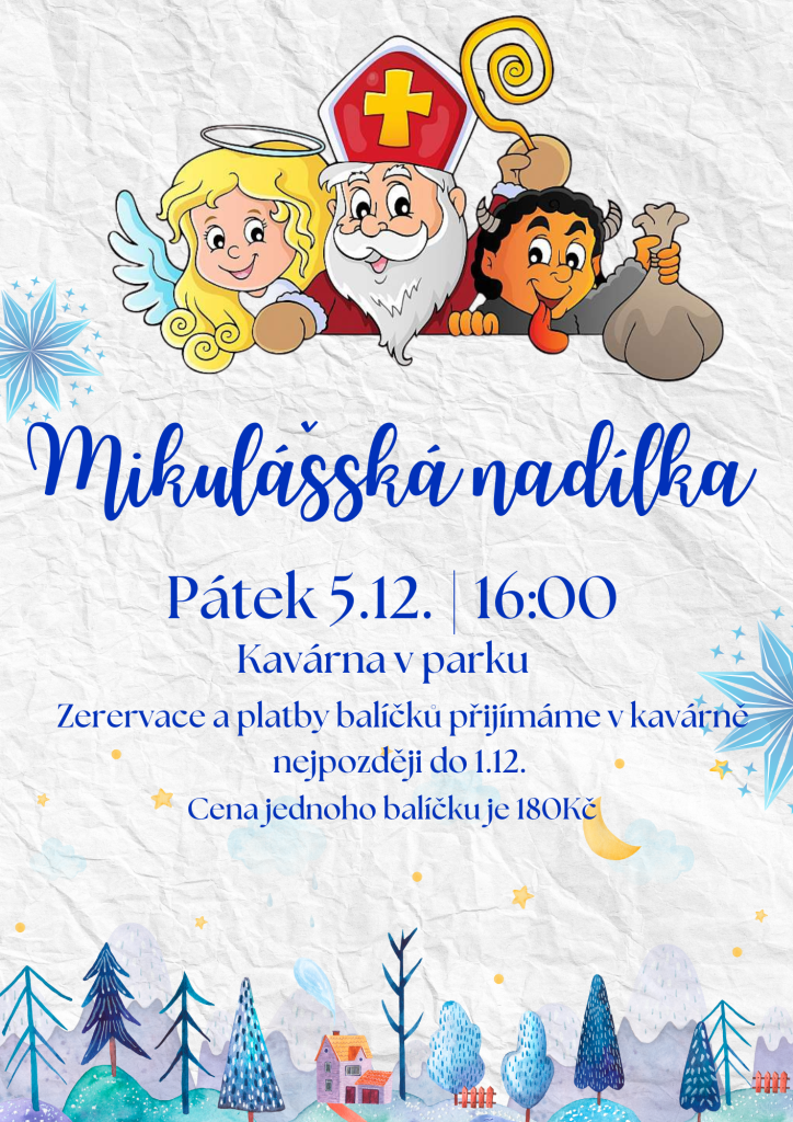 Přijďte si užít odpoledne plné kouzelné atmosféry s Mikulášem, andělem a čertem. Rezervace balíčků přijímáme do 1. 12. a cena je 180 Kč za kus. Akce se koná venku – nezapomeňte se teple obléct! Těšíme se na vás.