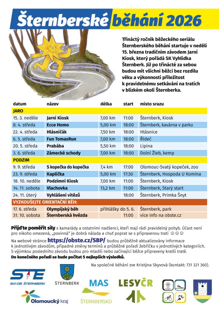 Třináctý ročník běžeckého seriálu Šternberské běhání je tu. Již po třinácté za sebou budou mít všichni běžci bez rozdílu věku a výkonnosti příležitost k pravidelnému setkávání na tratích v blízkém okolí Šternberka. Bližší informace k jednotlivým závodům najdete na přiloženém plakátu.
